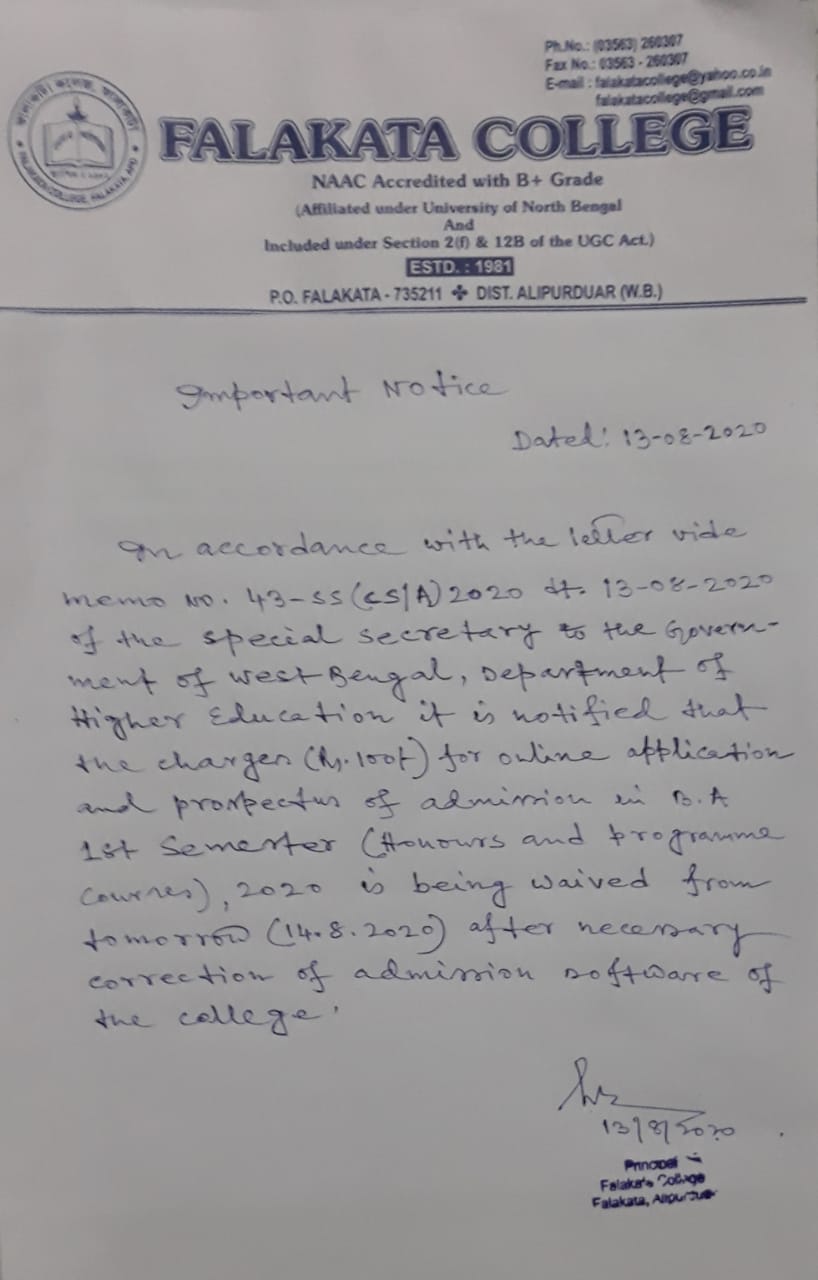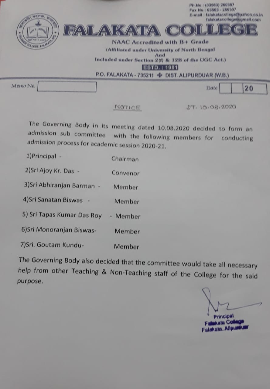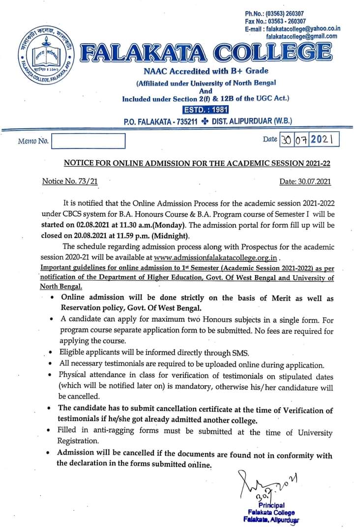 Notice for Admission for the session 2021-22 (Bengali Version).